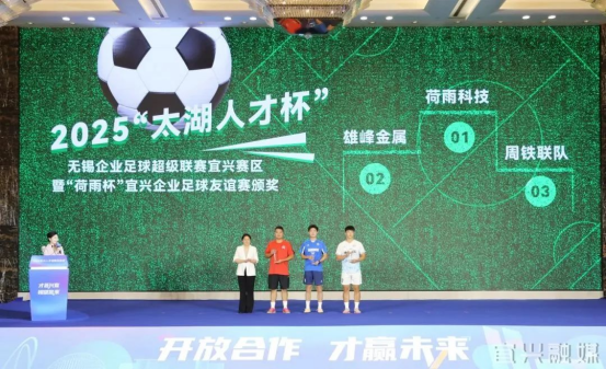 為獲獎球隊代表頒發了2025“太湖人才杯”無錫企業足球超級聯賽宜興賽區暨“荷雨杯”宜興企業足球友誼賽獎項。